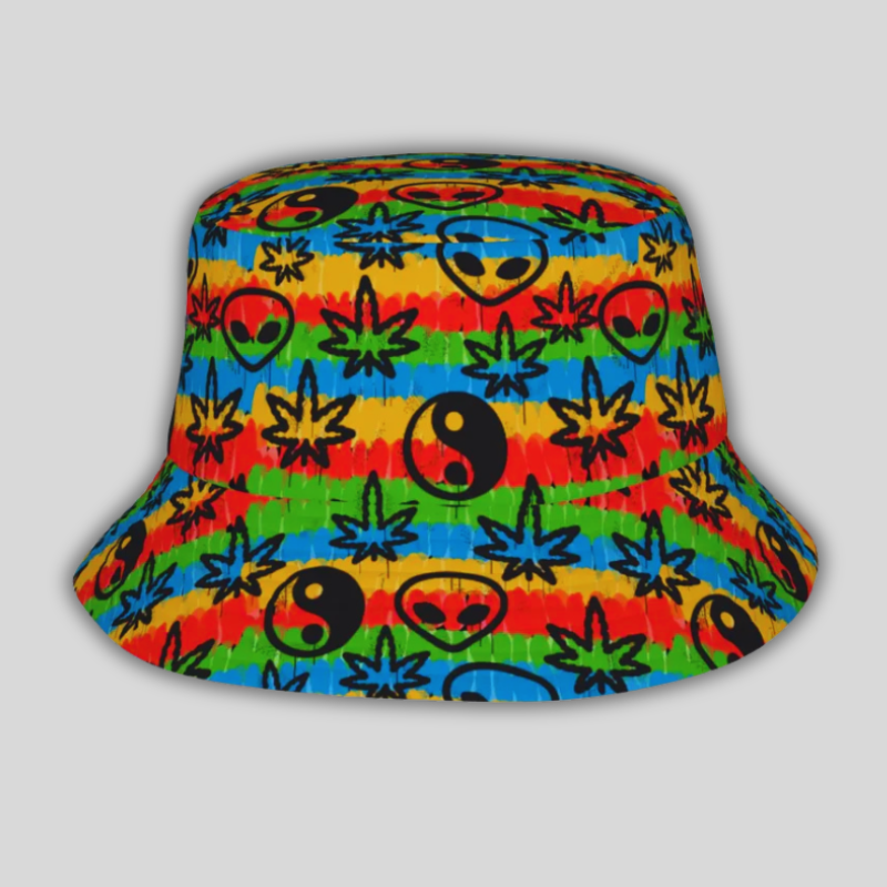 Rasta Tie-Dye Bucket Hat – Cannabis, Yin Yang & Alien Print Hippie Festival Hat