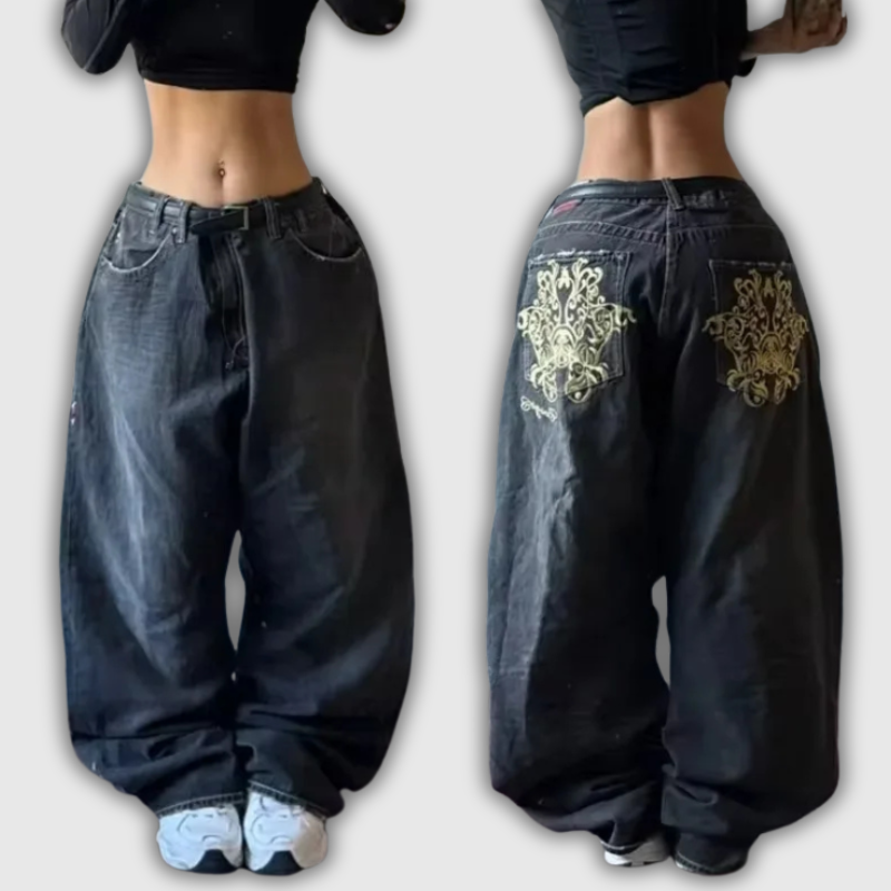 Channel nostalgic edge with our Golden Embroidered Y2K Wide Leg Jeans. Designed for those who embrace retro street fashion, these jeans feature striking pop-style embroidered letters, a relaxed baggy fit, and a light distressed wash. With a high waist and loose silhouette, they deliver both comfort and attitude—perfect for gothic, hip-hop, or casual aesthetic looks. Pair them with crop tops, hoodies, or oversized tees for the ultimate throwback outfit.