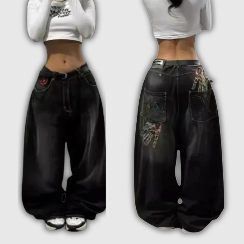 Unleash your inner rebel with our Y2K Gothic Embroidered Wide Leg Jeans. Featuring standout pop-style embroidery and a washed finish, these jeans embrace vintage hip-hop and gothic streetwear aesthetics. The baggy, wide-leg silhouette and high-waisted design offer comfort with a retro edge, ideal for those chasing edgy, alternative fashion trends. Style them effortlessly with platform sneakers or chunky boots for the perfect casual-cool fit.