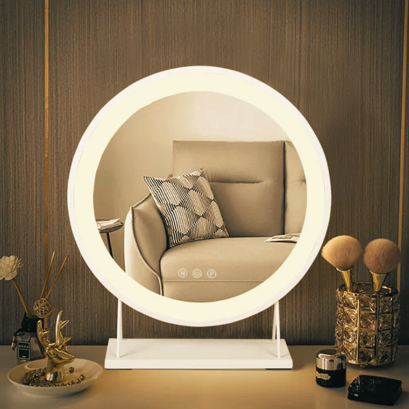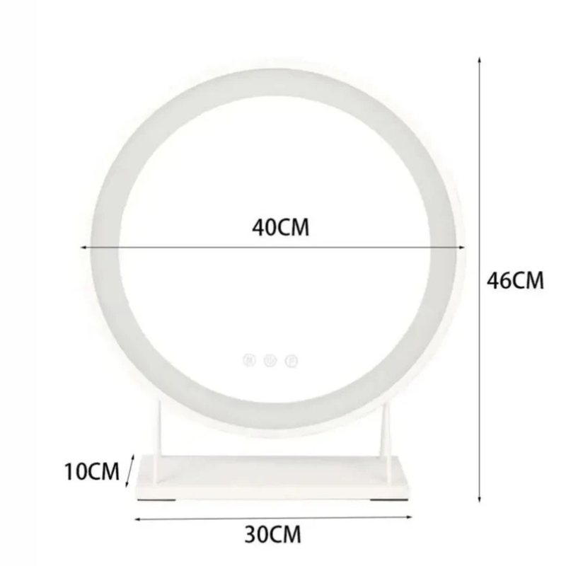 Transform your dressing space with the Luxeuria Luxe Round Hollywood Makeup Mirror. Designed for modern beauty lovers, this mirror features a seamless LED light strip encircling its edge, offering bright and soft illumination across three color modes: cold white, warm white, and warm. Easily adjust the brightness using intuitive touch controls, and enjoy the convenience of its memory function which remembers your last lighting setting. Crafted with a durable iron frame and clear glass, it sits securely on any tabletop or vanity—making it perfect for everyday glam or professional use.