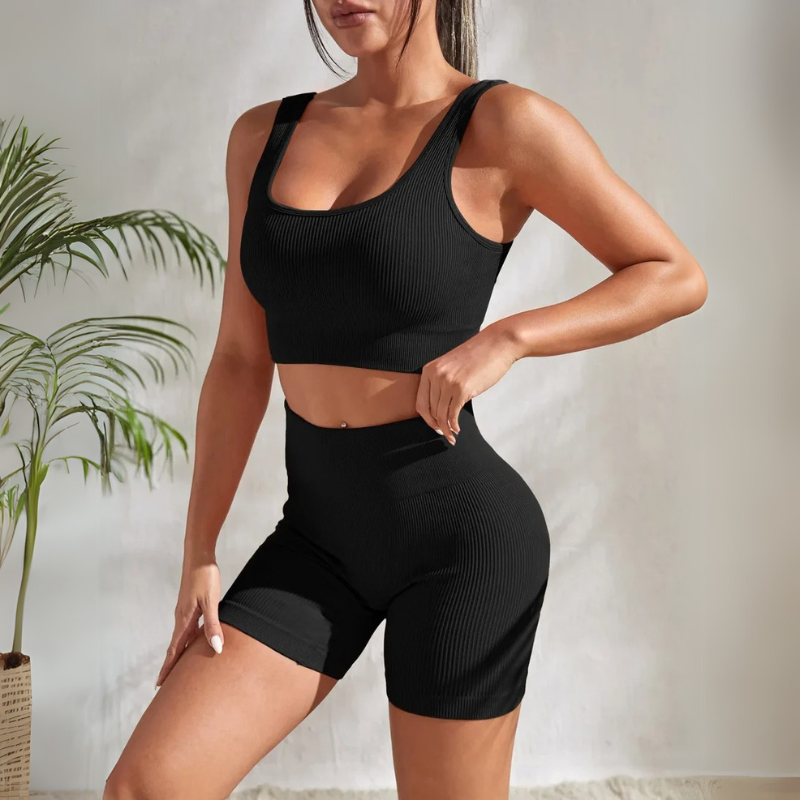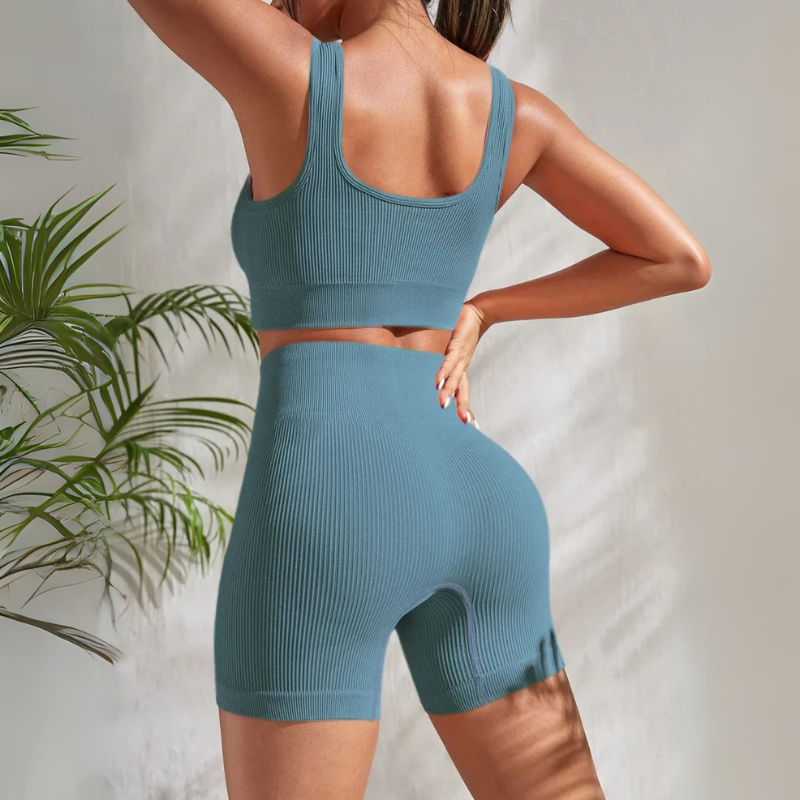 Seamless Ribbed Yoga Set – 2-Piece Gym Suit with High Waist Shorts & Crop Tank for Women