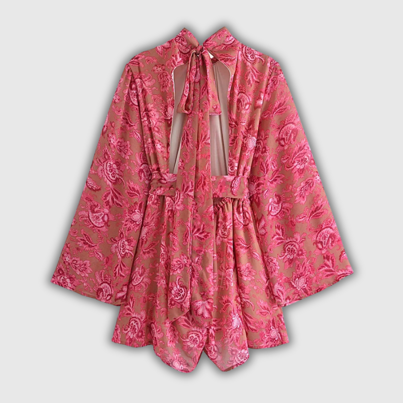 Chic and daring, this bohemian-inspired red floral romper combines elegance with beach-ready energy. Designed with a stand collar and sexy open back, it's made to flow with you through festivals, vacations, or sunny strolls. The wide-leg cut and soft polyester knit offer breathable comfort and effortless movement. With sizes up to 3XL, it’s a confident fit for any boho babe looking to make a bold statement.