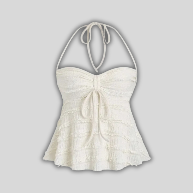 Women's Summer Casual Apricot Drawstring Halter Knitted Lace Textured Vest Top